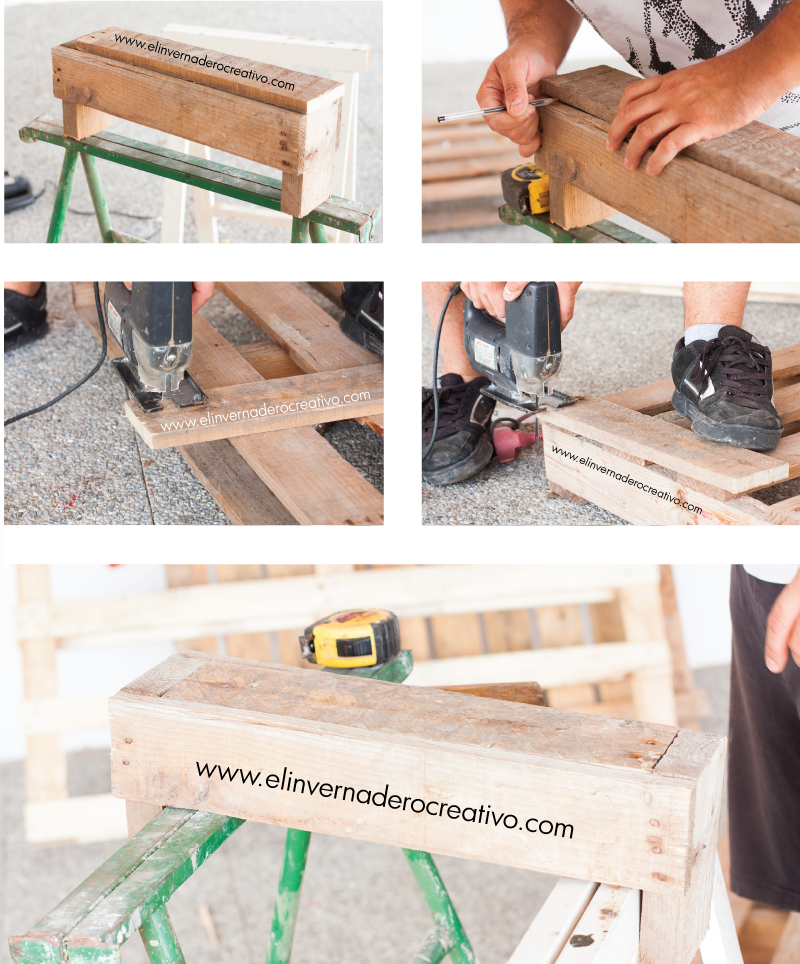 Empezaremos con nuestro perchero. Vamos a necesitar la mitad de un palé de listones. Con la caladora realizaremos los cortes tal y como os indico en la imagen. Toma medidas siempre para que no te quede un lado más largo que el otro.