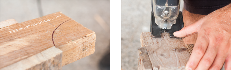 Para darle un poco de estilo a nuestro perchero vamos a darle forma. En los laterales dibuja un cuarto de círculo y de nuevo con la caladora sigue la línea marcada como te muestro en la imagen.