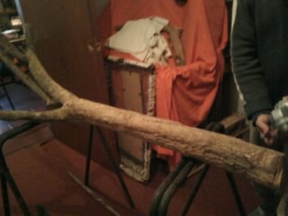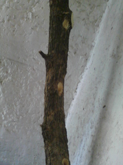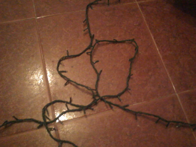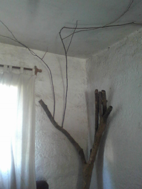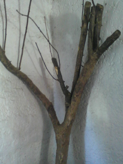Esas son las espinas de las ramas de la Santa Rita. Con mucha paciencia y cuidado corté todas las espinas para que no nos lastimara. Con un taladro hice unos agujeros en el tronco y ahí coloqué las ramas más finas, ya sin espinas. Un poco de cola vinilica aseguró el anclaje.