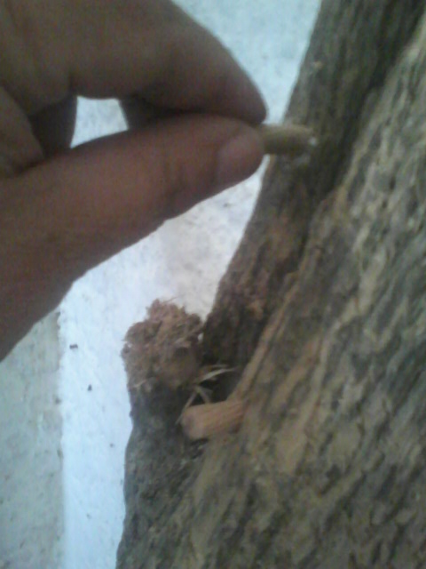 Hicimos un agujero con una mecha paleta de 22" para madera en la base del tronco e introdujimos un tubo de aluminio en el orificio.