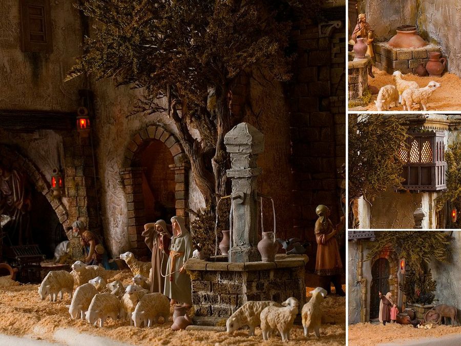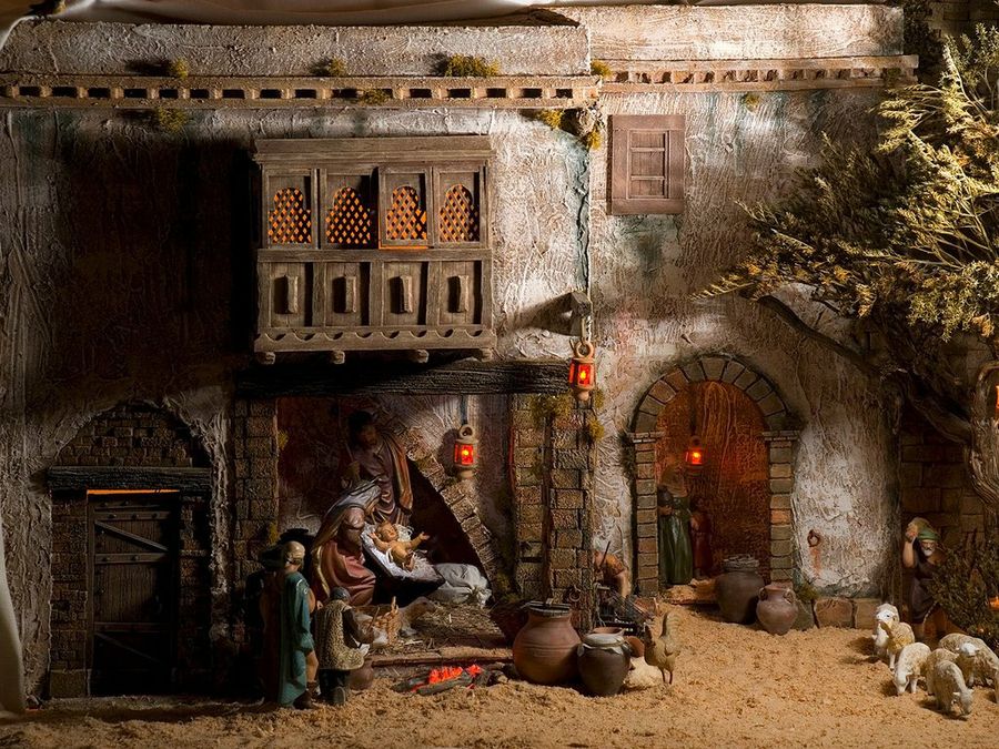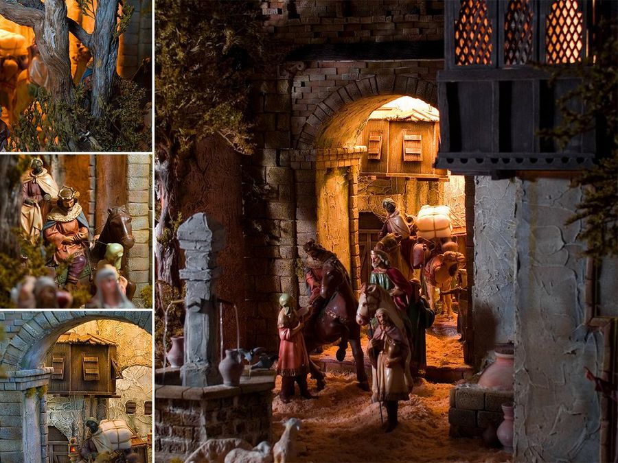 Observemos la cuidada disposición de las luces, que realzan cada espacio, así como el grato aspecto nocturno de la celosía, elemento muy característico de los belenes.