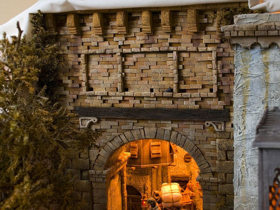 Vista frontal del diseño. El arco por donde llegan los Reyes Magos es el corazón teatral del Belén, y nuestro amigo ha subrayado la importancia de este elemento con una cálida iluminación, que simula la luz de las antorchas en los callejones de las ciudades antiguas.