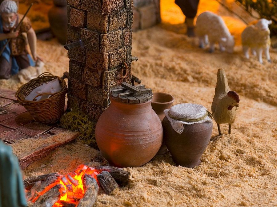 Volvemos al rincón del Nacimiento. Abundan los detalles de buen maquetismo, como los brotes de hierba en el friso de la fachada, la sólida puerta con refuerzos de metal, y las brasas del fuego.