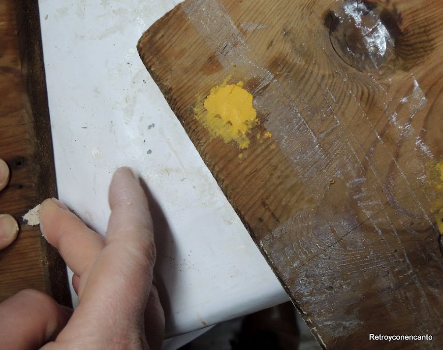Aplicamos el color muy aguado, pues ese era el efecto que queríamos conseguir, dejando la veta de la madera bien a la vista, para lo cual volvimos a lijar.