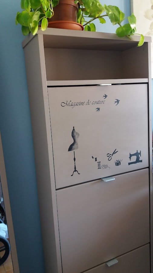 Este mueble zapatero, acabó siendo pintado en azúcar moreno (al igual que el marco del espejo) y los diseños los elegimos de un par de plantillas de estilo vintage.