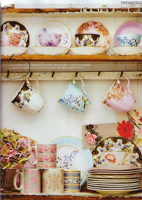 En vitrinas, estanterías o en simples colgadores lucen preciosas las tazas de te, platos, teteras, etc... y generalmente con un denominador común: las flores y los colores pastel. En estilos como el shabby, el rústico chic, cottage... queda genial decorar con el menaje de toda la vida. Se pueden encontrar con bastante facilidad en tiendas de segunda mano, mercadillos, anticuarios y a unos precios bastante asequibles.