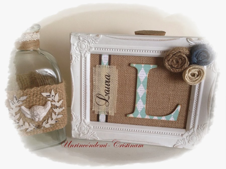 He quitado el cristal del marco y he forrado el fondo con tela de saco, arpillera....