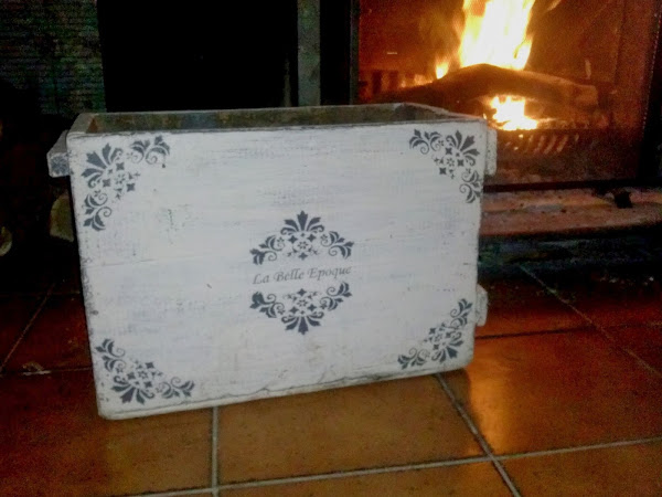 Un escabel realizado a partir de una caja de frutas. Proceso; lijar bien la caja, una mano de gesso, otra lijada, una mano de pintura acualux de titan color chocolate, una vez seca paso la vela por los sitios que quiero que salga el color oscuro luego un par de manos de blanco roto, los motivos frontales y laterales realizados en relieve con una plantilla de Lucía y para terminar una puntilla alrededor.