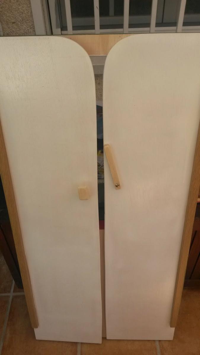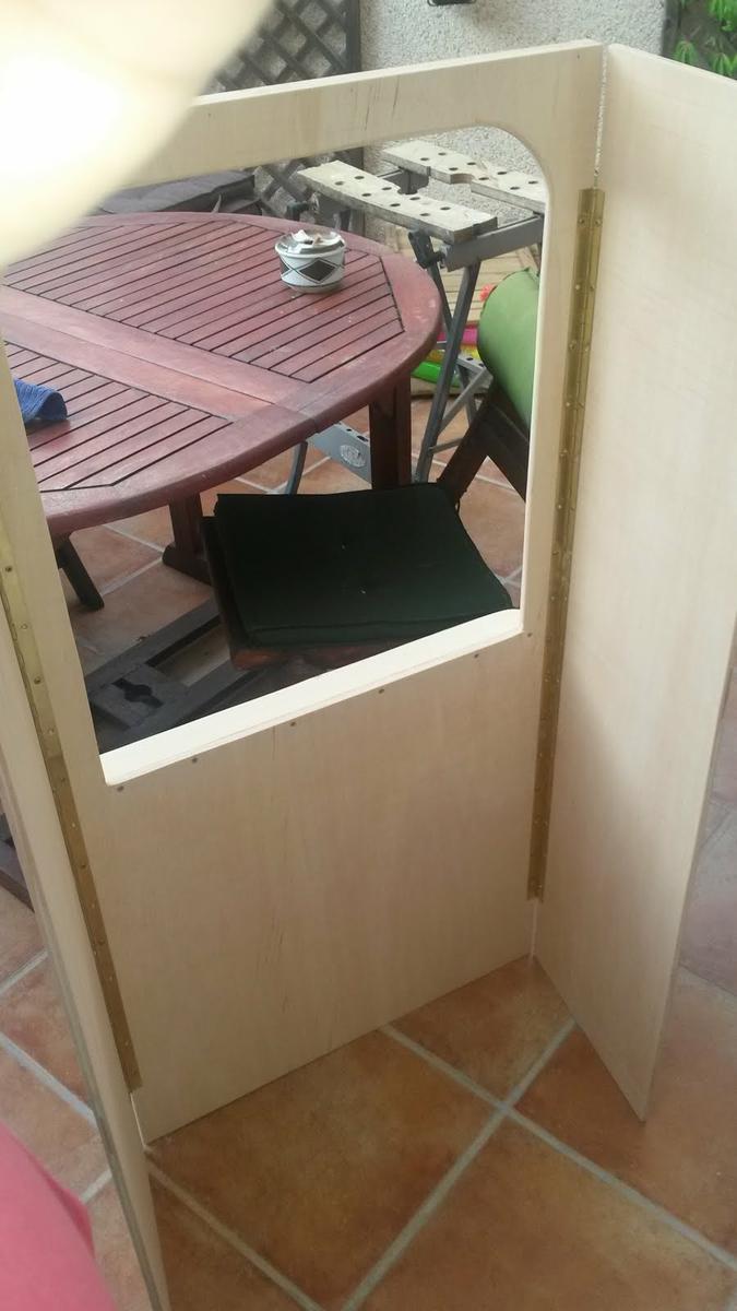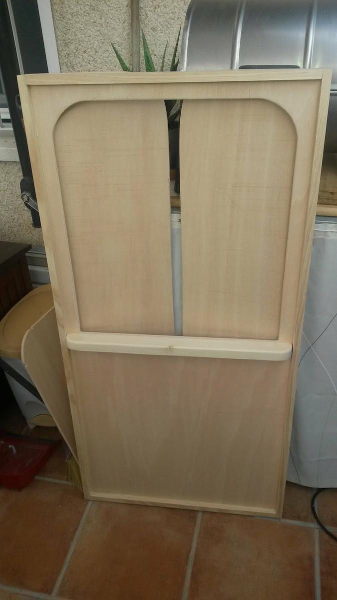 En la parte forntal realicé el hueco con la caladora y le realicé un marco con unos listones de madera de pino alrededor para darle un poco más de “cuerpo” al conjunto y que no quedara muy endeble, en un lateral de las puertas también incorporé listones para que me permitieran atornillar las bisabras sin problemas.