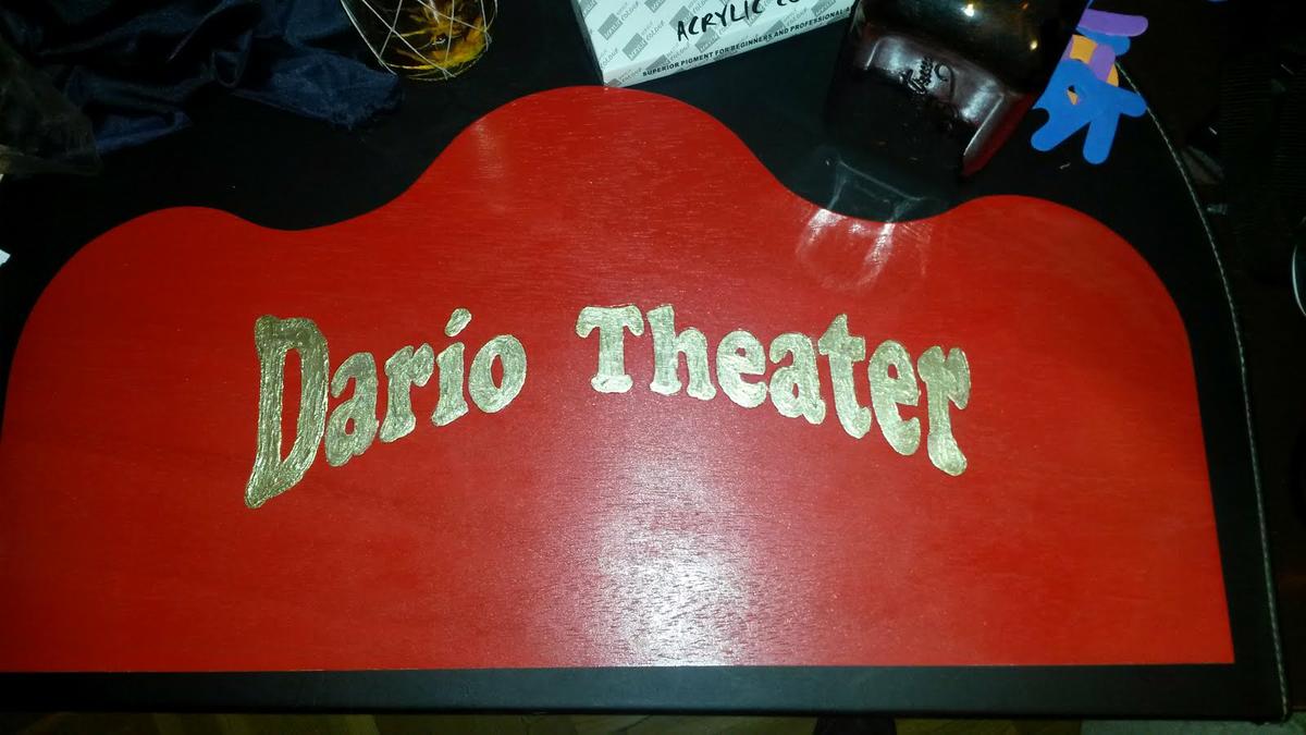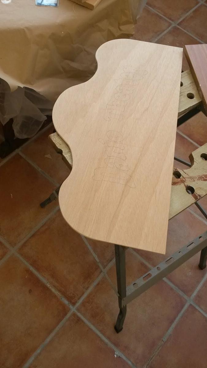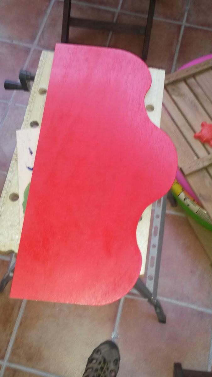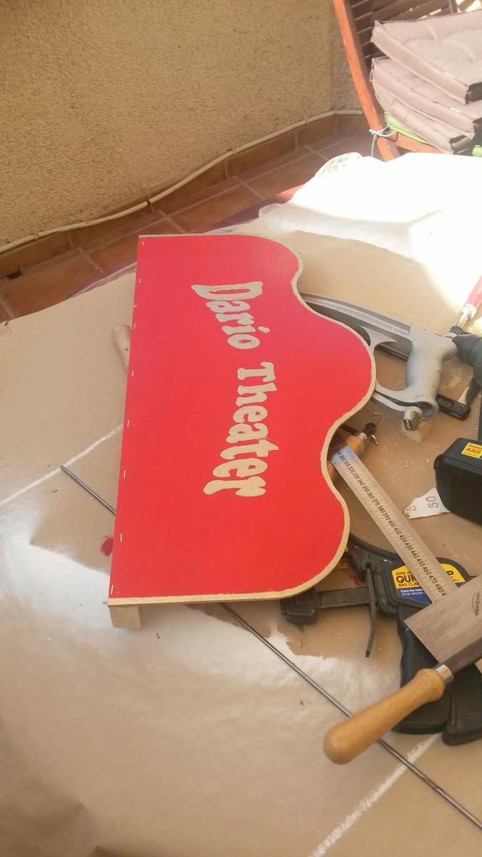 Recorté un contrachapado finito para realizar un cartel en la parte superiór que además de decorar permite elevar un poco la altura del teatro para ocultar a un adulto en la parte trasera sin mucho esfuerzo.