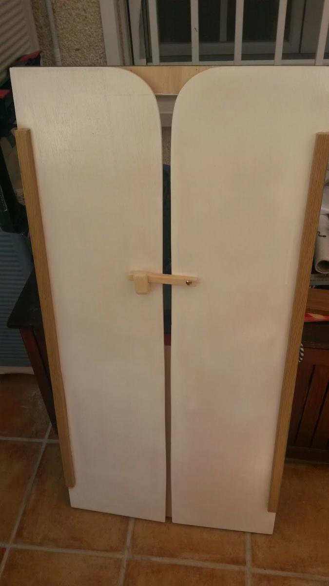 Pensando en que sus padres no tengan problemas a la hora de guardar el teatro , con unos trozos de madera de pino le hice un cierre y un pestillo para mantener las puertas cerradas al almacenarlo.