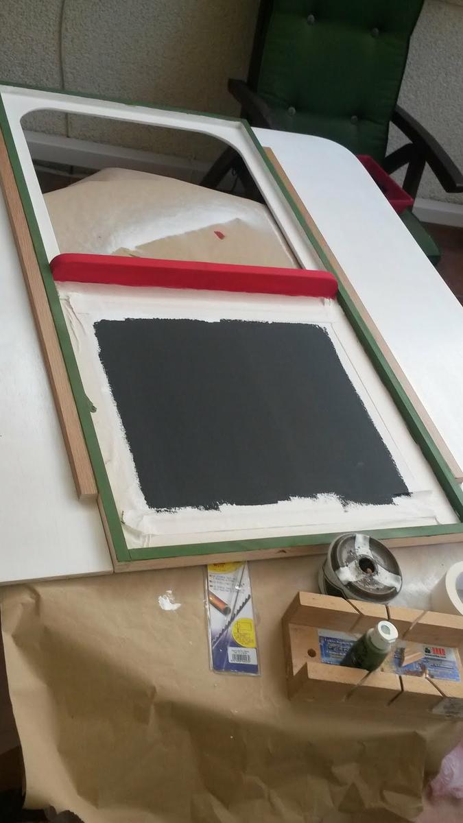 Compré un bote de pintura especial para pizarras y le apliqué un par de manos a un cuadro perfilado con cinta en la parte inferior al que después le hice un cerco con unas molduras para que Darío pueda desarrollar sus aptitudes artísticas.