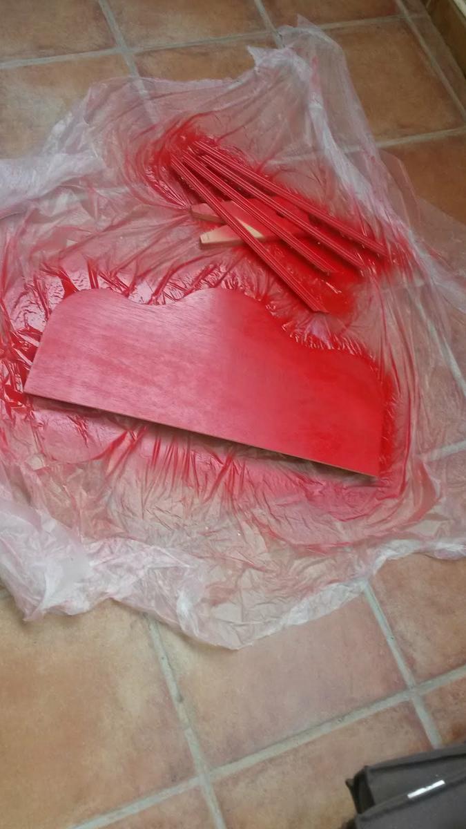 Para facilitar el guardado decidí poner en la parte superior del guiñol unos tubillones y en la parte posterior del cartel un listón de madera con unos orificios para poderlo poner y quitar facilmente, el listón lo pegué y fijé con grapas por la parte delantera del cartel que después taparía con una pequeña moldura pintada de dorado.