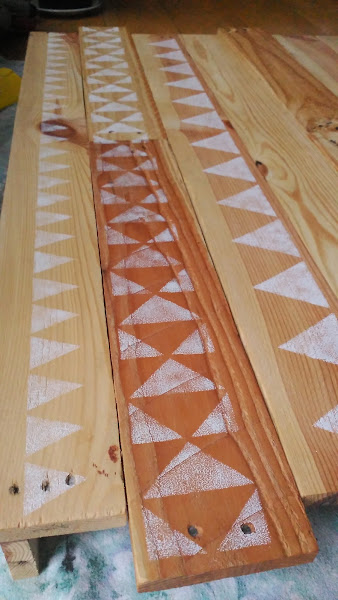 Primero hice en un folio lo que sería la plantilla (con unos dibujos geométricos) para hacer el estarcido sobre la madera, lo cual haría con pintura blanca.