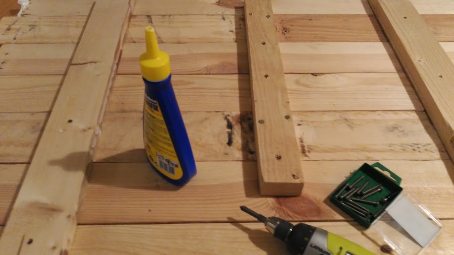 Para unir las piezas utilicé cola blanca de carpintero y tirafondos. Las tablas irían unidas a unos listones colocados a modo de rastreles en la parte trasera.