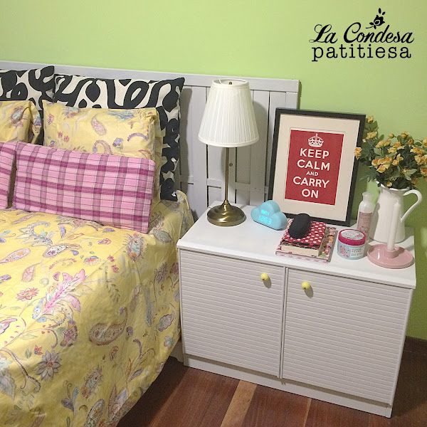 Y así lo tengo colocadito, como mide 180 centímetros es más grande que mi cama y sobresale un poquito que es algo que buscaba a propósito para que se viera más y que no lo tapasen del todo las montañas de cojines que tengo puestas delante. Quizá con el tiempo intente subirlo un poquito pero del otro lado tengo una cómoda alta (que os la enseñaré más adelante) y no quería sobrepasarla de altura...