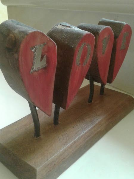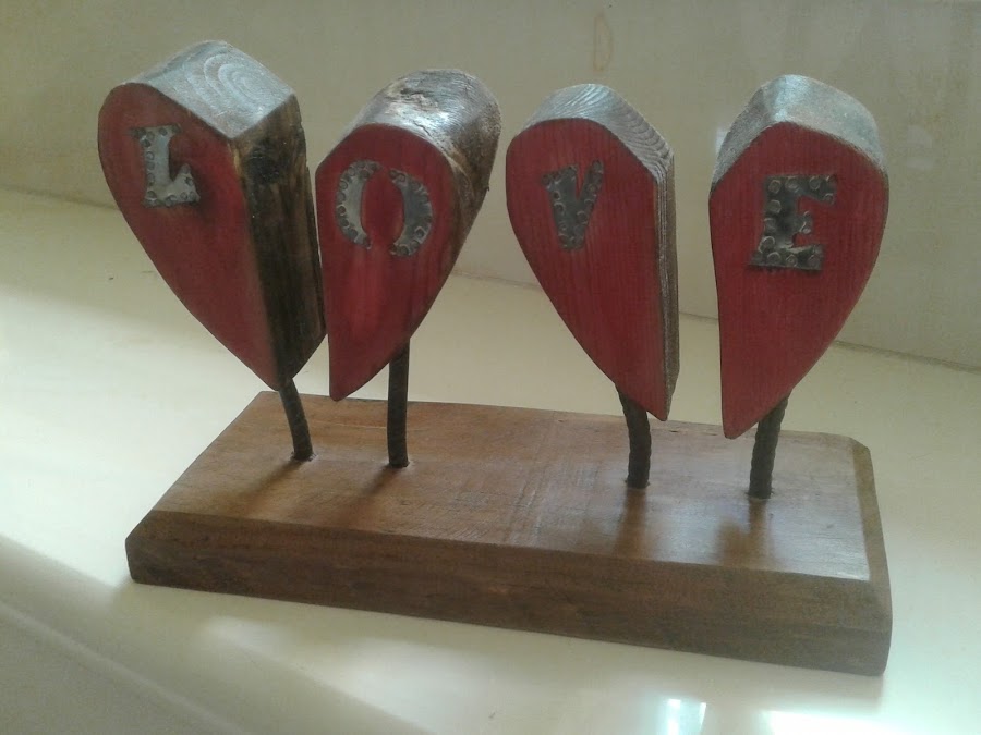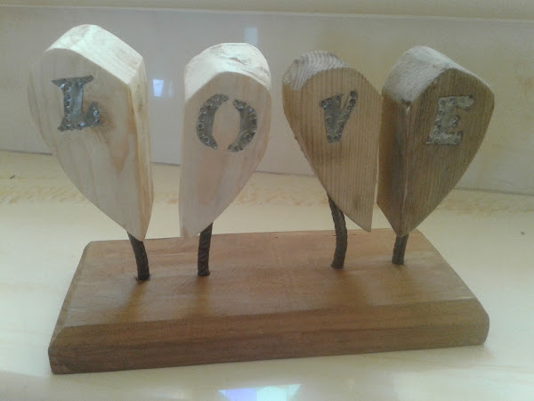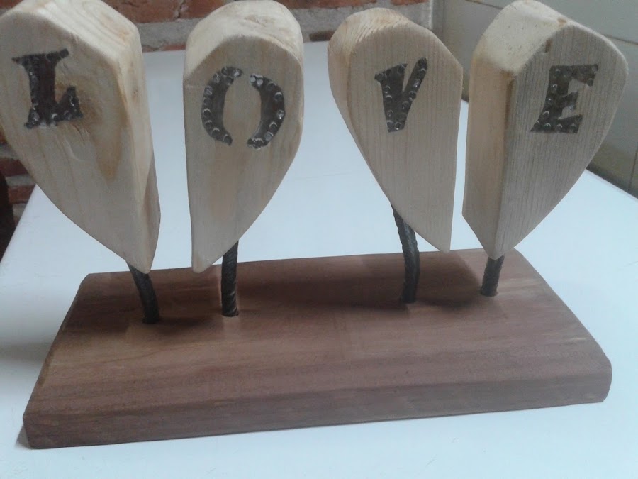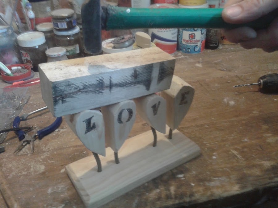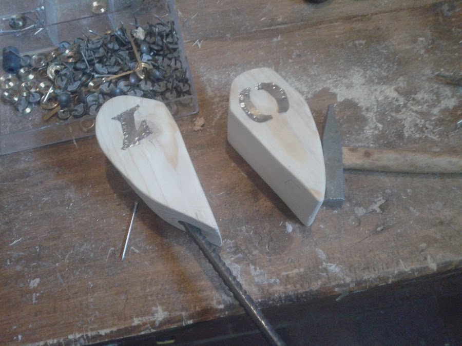Voy clavando las letras en cada parte del corazón, primero con una punta mas fuerte hago los agujeros sobre la chapa y después con clavos muy pequeñitos las voy clavando.