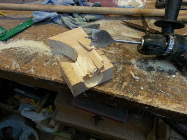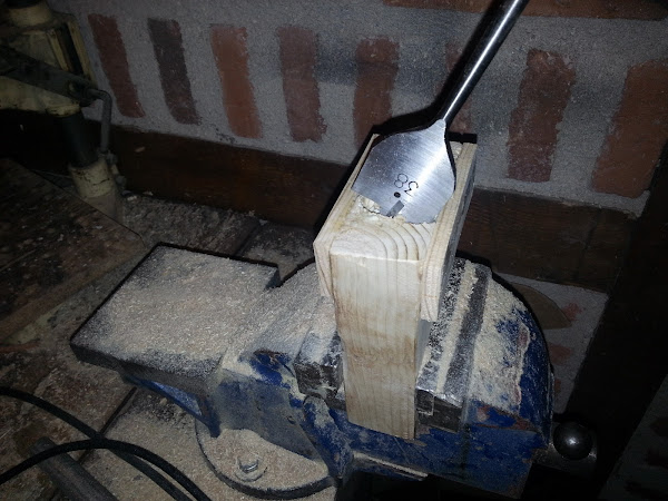 Con la broca de pala, del grosor de las velas pretendo hacer los agujeros, pero os muestro que a veces no todo sale a la primera y en este caso la madera se reventó.