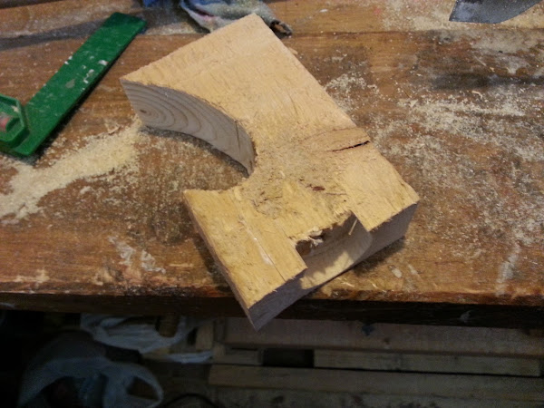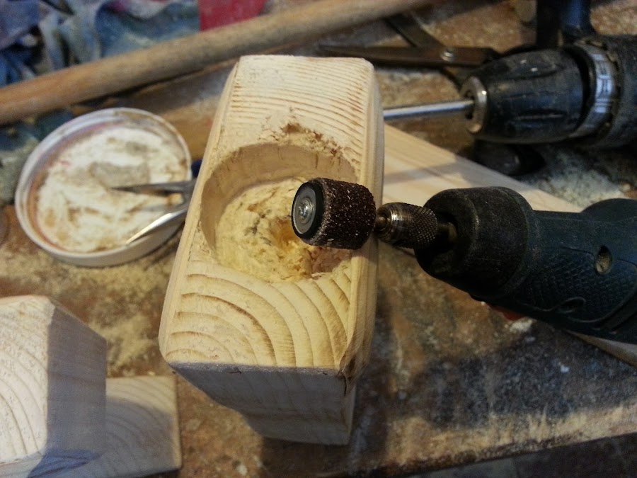 Donde la madera se reventó, hago preparado de serrín tamizado (muy finito) y cola de carpintero y voy emplasteciendo las faltas de la madera. Y luego cuando seca lo emplastecido, con la multiherramienta pulo dando forma.