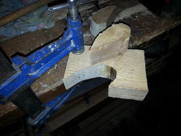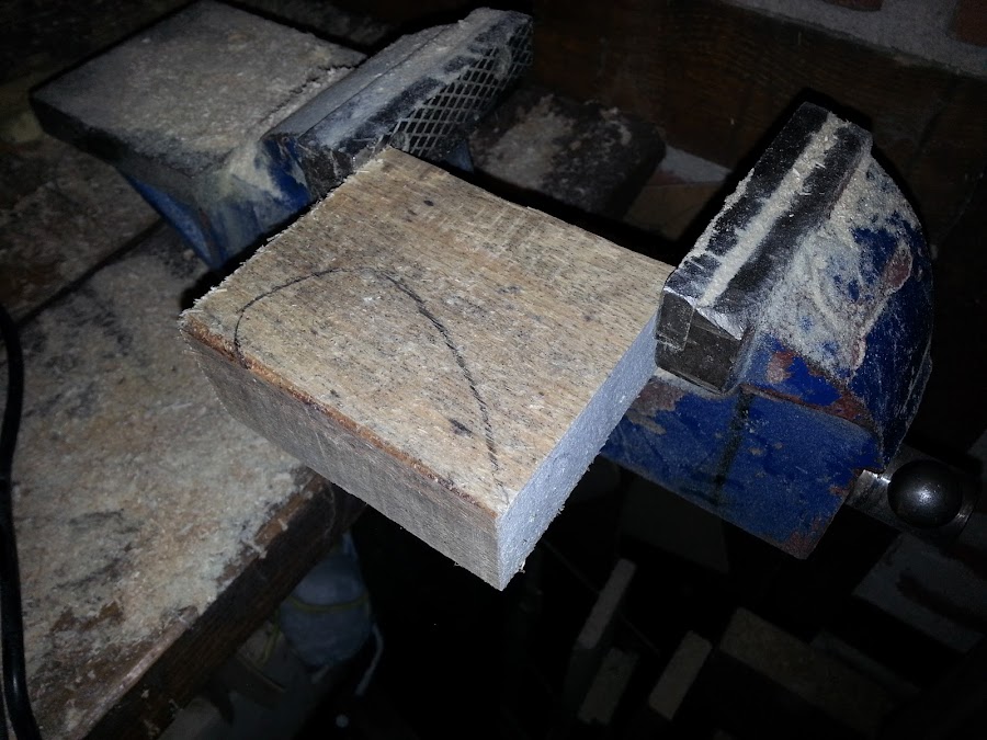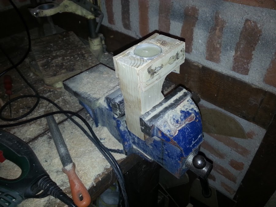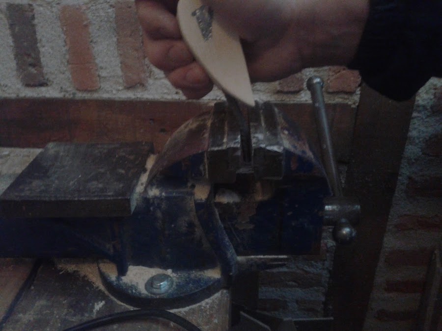 Para dar los talador al corazón, lo fijo en el gato de mi banco de trabajo, y le pongo unas madera a modo de martil, para que no me marque la madera al apretar.