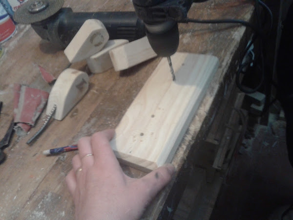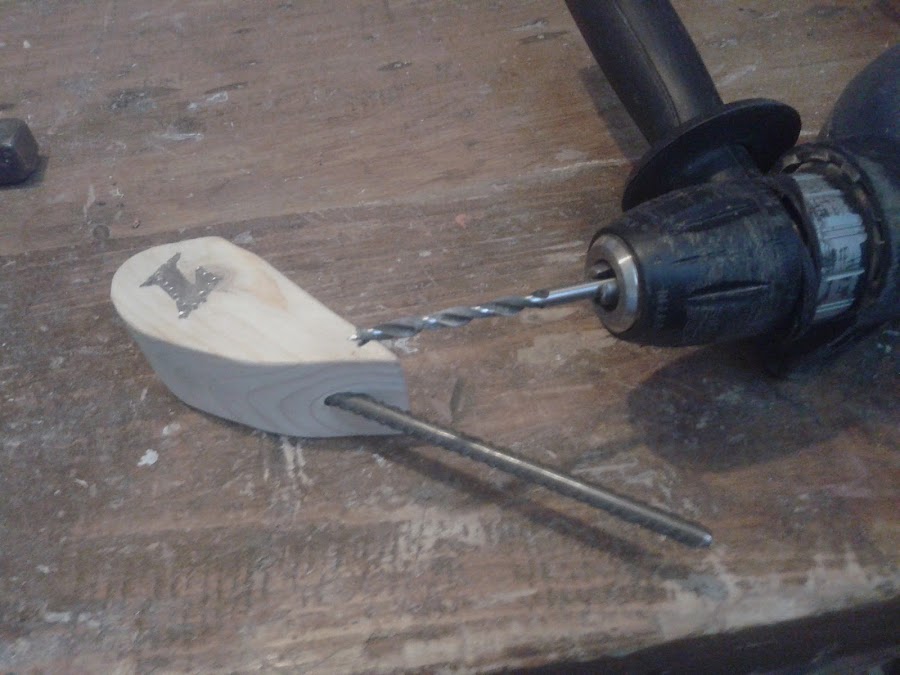 Con una broca de madera, del grosor 5mm doy unos taladros en la madera que será la base de la escultura, para poder clavar las varillas que sujetan los corazones.