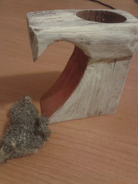 Comienzo tiñendo las velas, con un macerado de vinagre y lana de acero. Una vez tiño con esto paso estropajo de esparto.