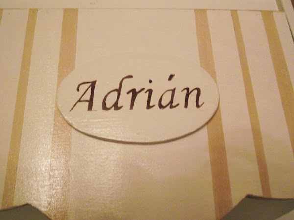 Para estarcir el nombre me fabriqué una plantilla casera: imprimí en un acetato las letras y recorté con un cúter de precisión. Como sólo va a servir una vez no importa que el acetato sea finito, se corta mejor y queda igual de bien.