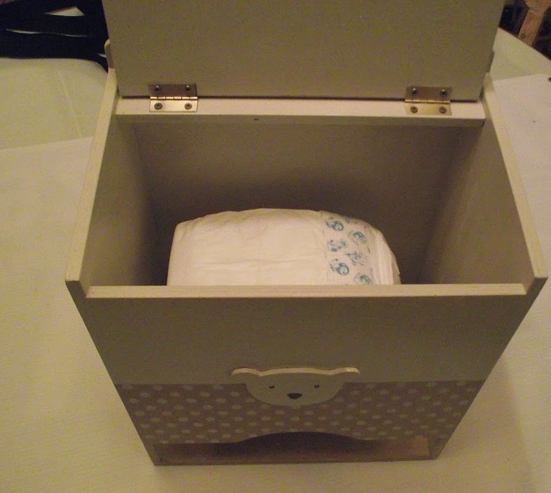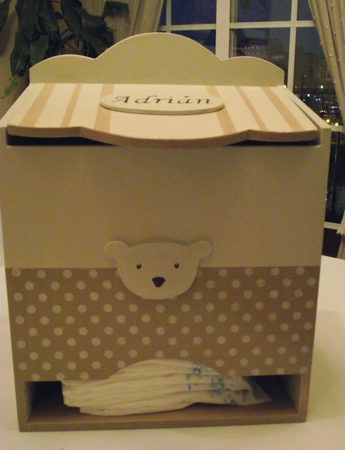 El pañalero lo descubrí cuando estuve en la feria de manualidades de noviembre en Madrid, en Manualidades Topaz. Me pareció práctico y decorativo para la habitación de un bebé y como entonces ya estaba Adrián en camino me lo traje para decorarlo. Como aún no sabíamos el sexo del bebé elegí tonos neutros que además combinan bien en cualquier habitación: blanco roto, marrón clarito y marrón chocolate para los detalles.