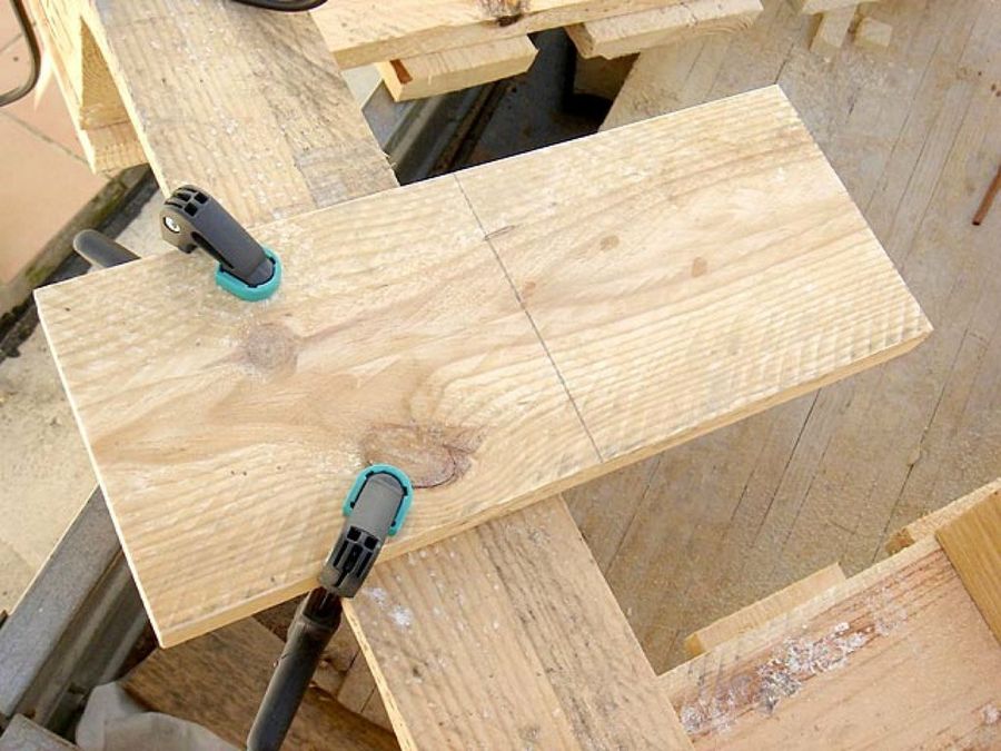 Encolamos las tablas y los agujeros, introducimos las espigas, y damos presión con la mordaza, necesaria para que la cola de carpintero trabaje correctamente. Hemos aprovechado el triángulo de madera que eliminamos con la sierra.