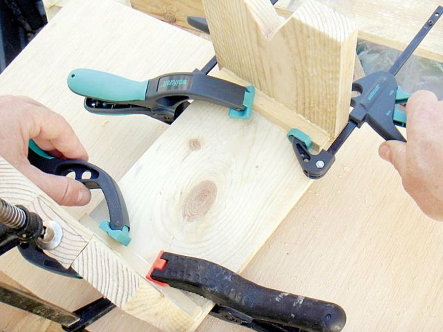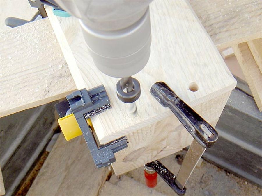 Hacemos los correspondientes taladros, que estarán justo en el centro de la tabla vertical. La función de las espigas es reforzar la unión de ambas maderas. Al comprobar que las mordazas de resorte se deslizaban con el empuje de la broca, hemos colocado un tornillo de apriete.