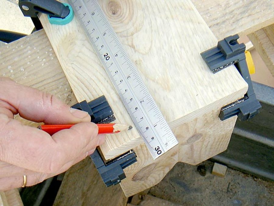 Ahora pondremos las espigas. Con las mordazas angulares que conocemos de otro reportaje, sujetamos a escuadra las dos piezas que vamos a unir, y medimos 1 cm desde el borde.