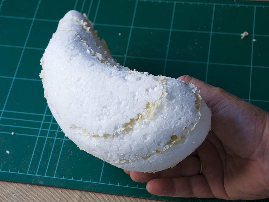 Los estratos de adhesivo cumplen bien su función de mantener la unidad del bloque sin oponer al lijado más resistencia que el porexpán. En caso contrario, se formarían crestas indeseadas, alterando el perfil de la figura.
