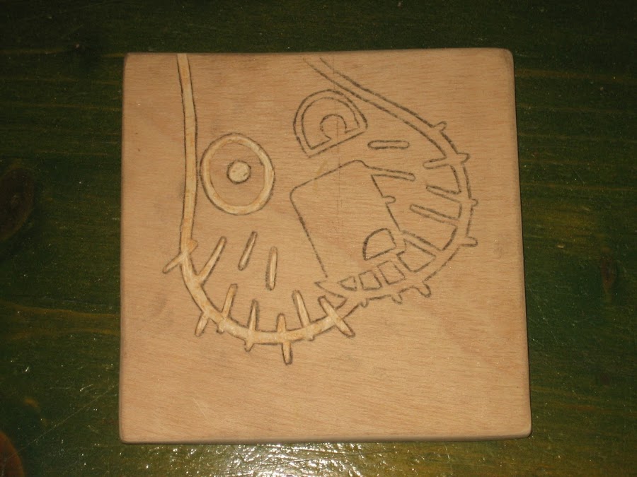 Una vez tallado el contorno lo quemaremos con pirógrafo para destacarlo del fondo, que será en decapé blanco.