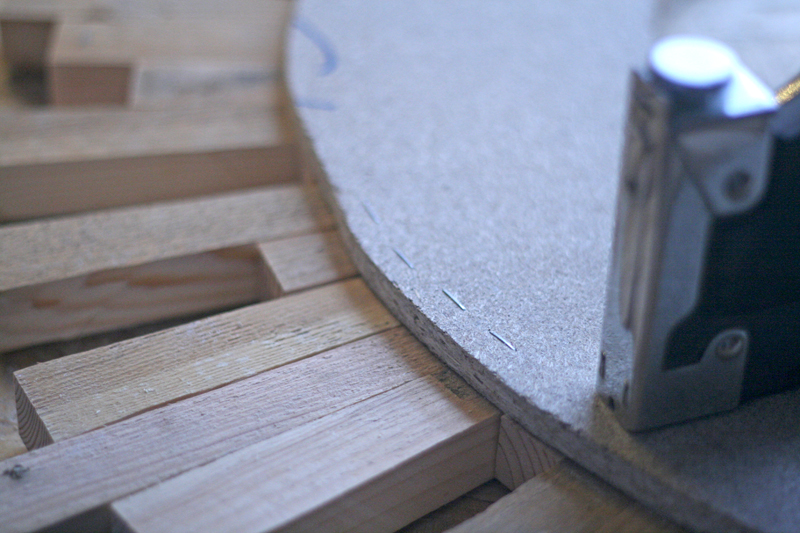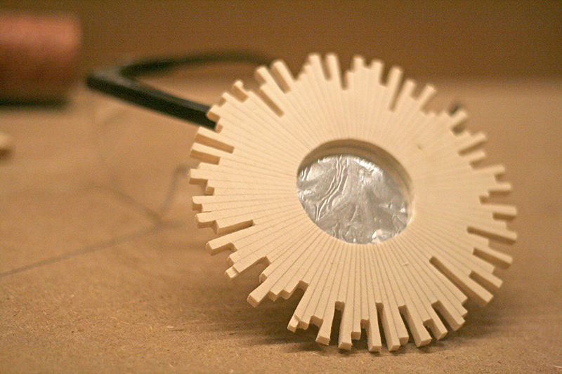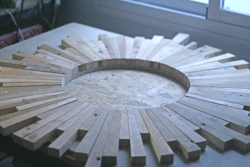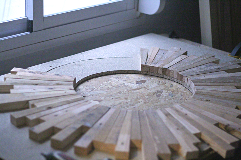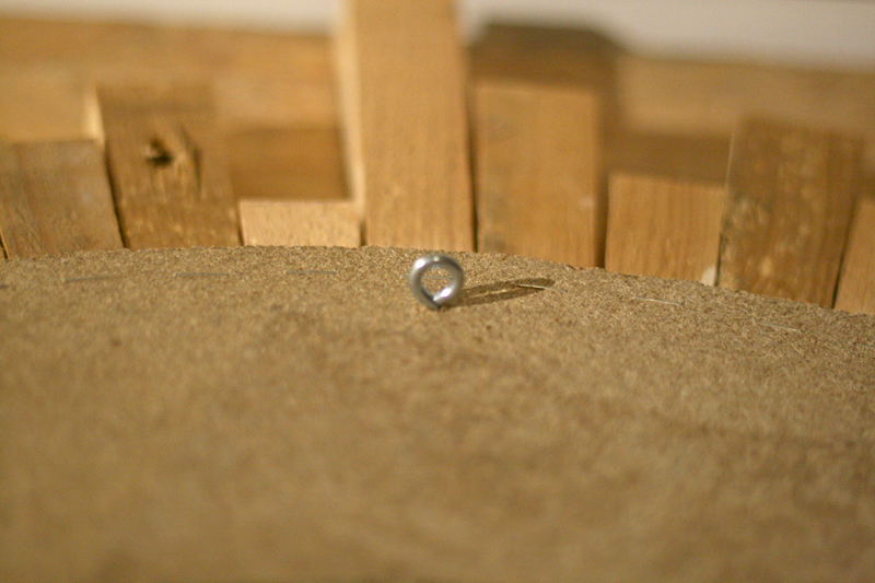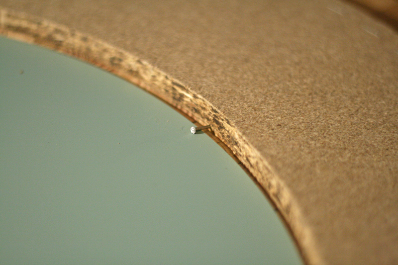 Tras el fresado, presentamos nuestro espejo (cortado 1 cm más grande que la circunferencia exterior) y lo fijamos con puntillas,