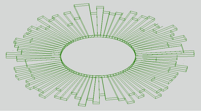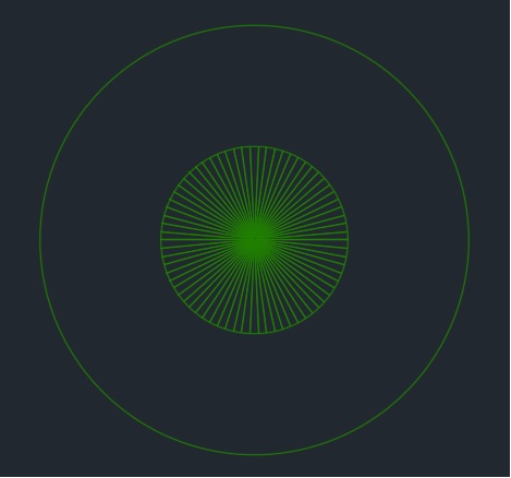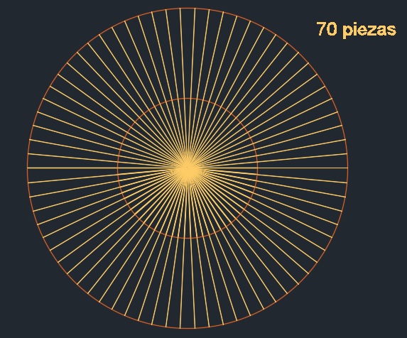 Dividimos la circunferencia interior en 70 segmentos usando el comando "Divide" y unimos cada punto resultante con el centro de la circunferencia,