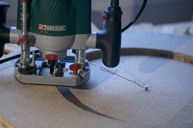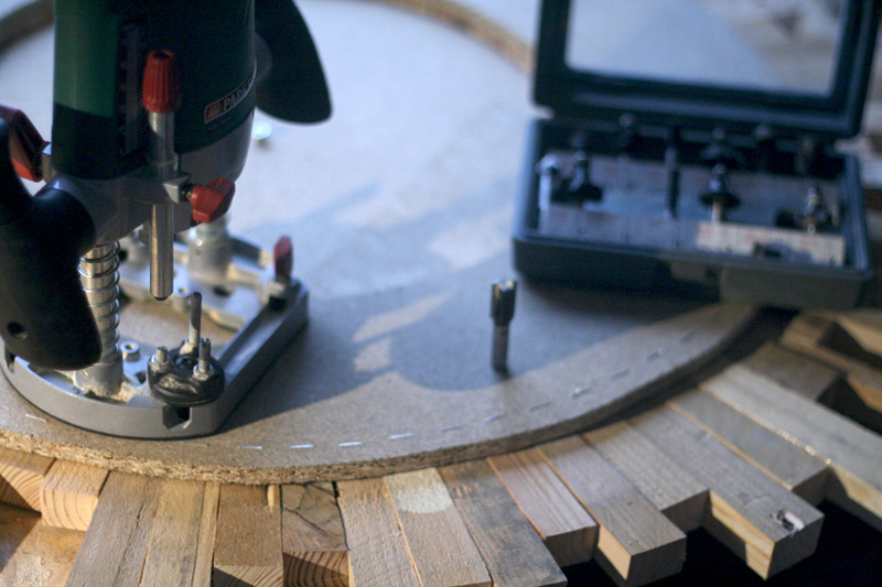 Para encajar nuestro espejo necesitaremos hacer un vaciado o rebaje a modo de carril a lo largo del diámetro interior. Para ello usaremos una fresadora con una fresa de vaciado recta. La profundidad será al gusto. En mi caso profundicé 1,4 cm. ( 9 mm del aglomerado y 5 mm de listón) dejando 1 cm entre el cristal y la cara exterior de los listones.
