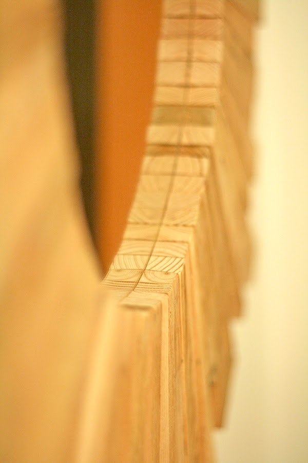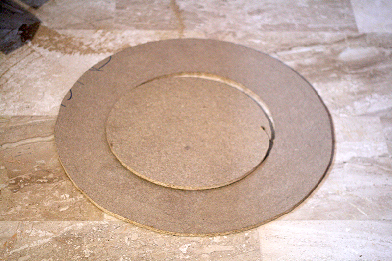 Lo primero que haremos será marcar las dos circunferencias sobre el panel de aglomerado y cortaremos con la sierra de calar las dos lineas, quedándonos la base sobre la que mas adelante irán montados los listones y el espejo.