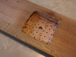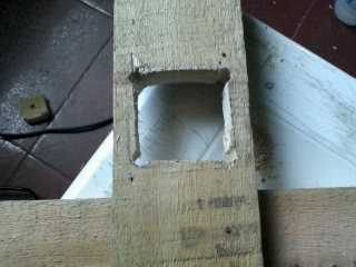 En la madera que queda ubicada en el medio del tablero hice un agujero con el taladro y una mecha para madera de 10". Aquí también marqué el contorno del mecanismo del reloj pero para vaciar el espacio hice agujeros con la misma mecha (se pueden ver los puntos de apoyo marcados en la caja) y luego terminé la tarea con un formón.