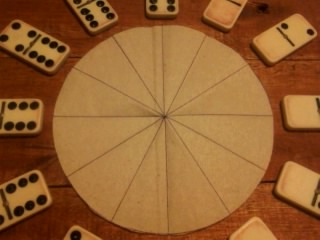 Es importante que las fichas queden a la misma distancia; para ayudarme con eso hice una guía con una circunferencia sobre papel y la dividí con 12 trazos equidistantes. Cada ficha del dominó irá alineada con cada trazo para respetar las distancias.