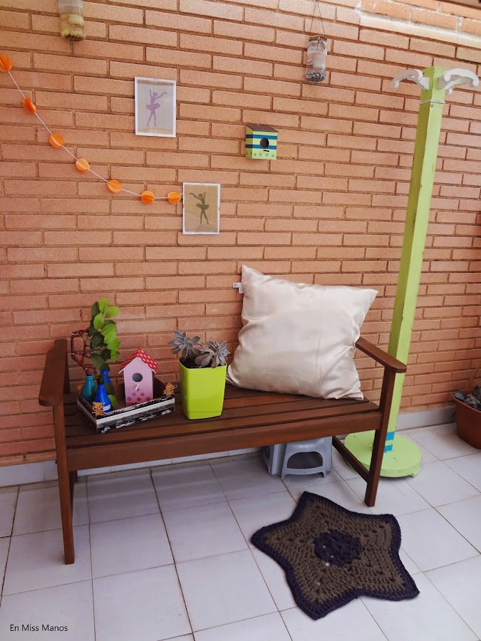 El banco de madera también salió gratis, porque lo encontramos en el contenedor de la mueblería, así que cómo véis, ha sido una decoración muy low cost!