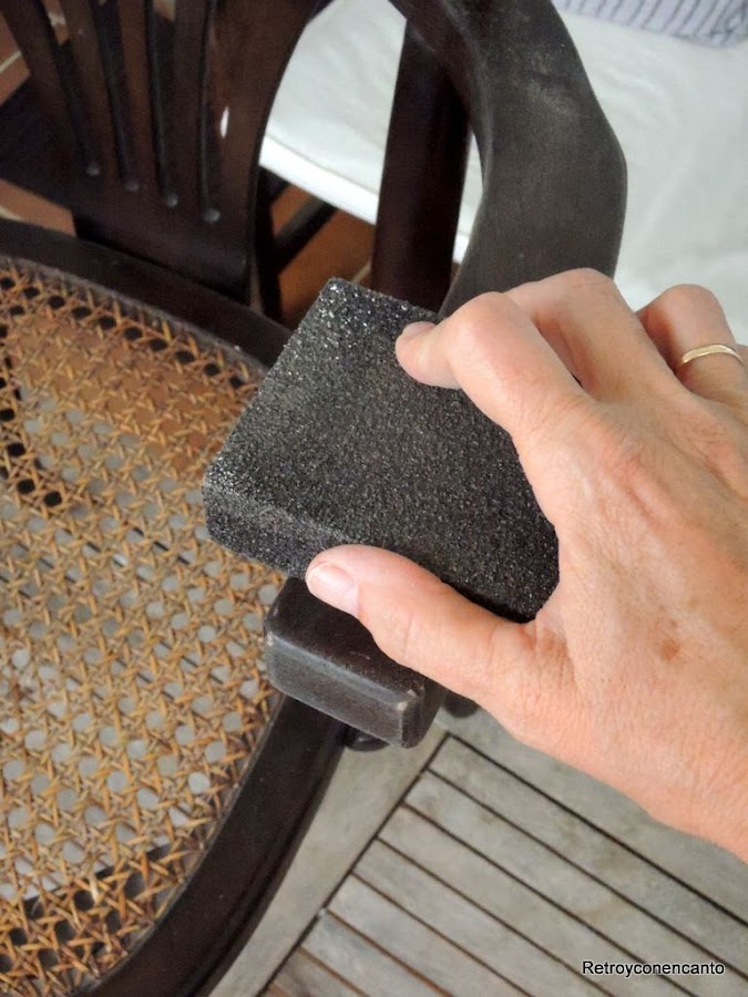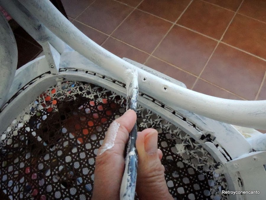 ..., y que así agarre mejor la pintura, a la tiza, en este caso. Al ser un asiento tan curvilineo, lo hemos pintado íntegramente con brocha.