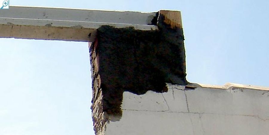 La primera viga de hormigón ya se ha montado. El hueco que se le ha abierto en la pared es de considerable profundidad, casi tan ancho como dos ladrillos. Un albañil de primera sabe dónde hacerlo para no dañar la estructura. Por el extremo de la caseta, la viga se “funde” al murete con una carcasa de ladrillo.