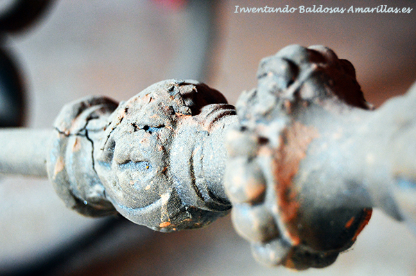Para los visuales: una fotografía desembocada en el primer plano. Se trata de parte del soporte metálico de una mesa de madera. Los visuales apreciarán los diferentes tonos del metal, los contrastes de la luz y las machas de pintura color ocre sobre la superficie.