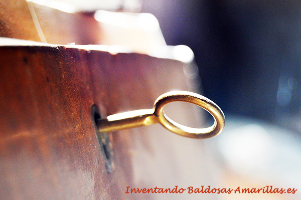 El sol reflejado en una llave de un escritorio de madera antiguo.