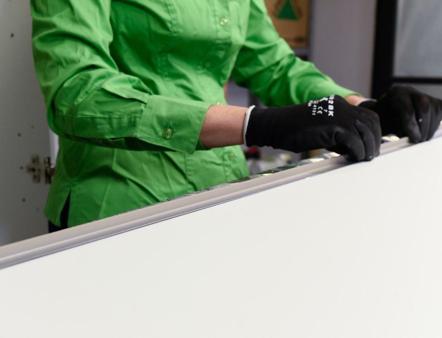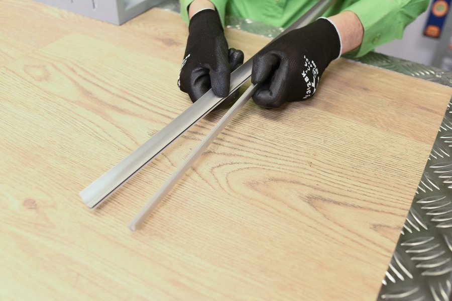 3. A continuación pegaremos o graparemos las bases de los perfiles a la puerta, dejando a un lado los embellecedores.