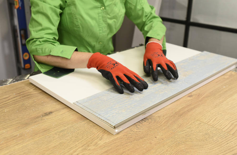 4. Seguiremos midiendo las lamas y cortándolas con la sierra de calar o un cúter. Después aplicaremos cola acrílica para pegarlas. Podemos empezar alineando la primera lama con el borde, para seguir encajando las demás.