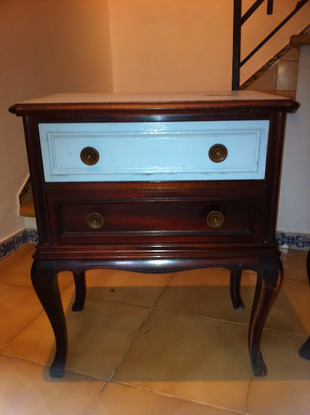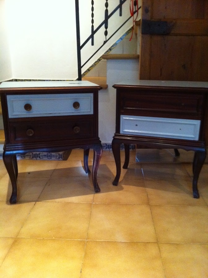 Empecé a restaurar estas mesitas hace una semana, y la verdad es que me he quitado un peso de encima, por que lo que, en principio, no me habría llevado más de dos tardes, se ha convertido en una odisea debido al tinte que tenían, que no se podía eliminar lijando y que capa tras capa reaparecía, y reaparecía...