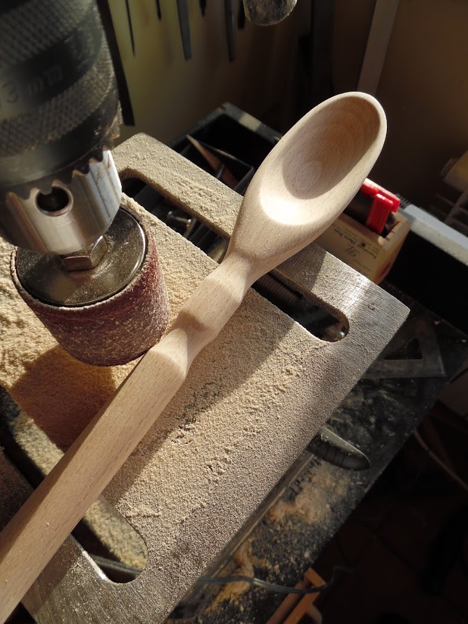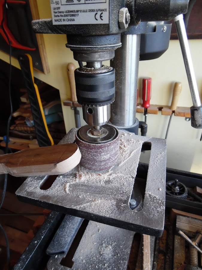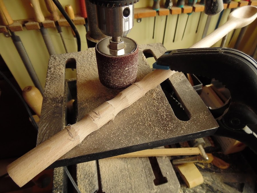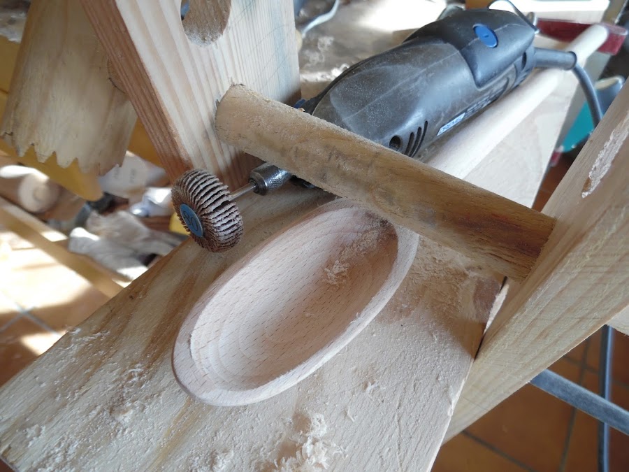 Ahora voy a utilizar la lija del taladro para hacer unos cuantos rebajes en el mango simplemente por darle un toque personal.
