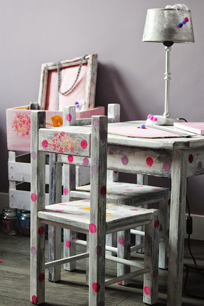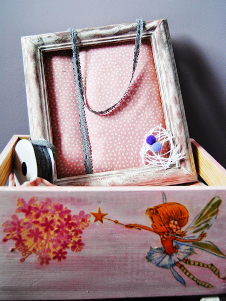 La mesilla son tres cajas: dos de cerezas en blanco y una más de madera en rosa. Como me parecía que quedaba demasiado baja, unos tarros de cristal hacen de pies.