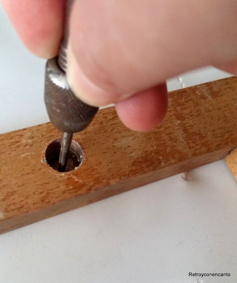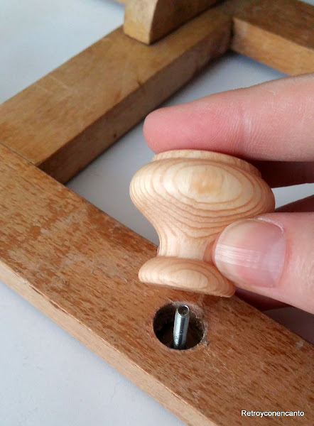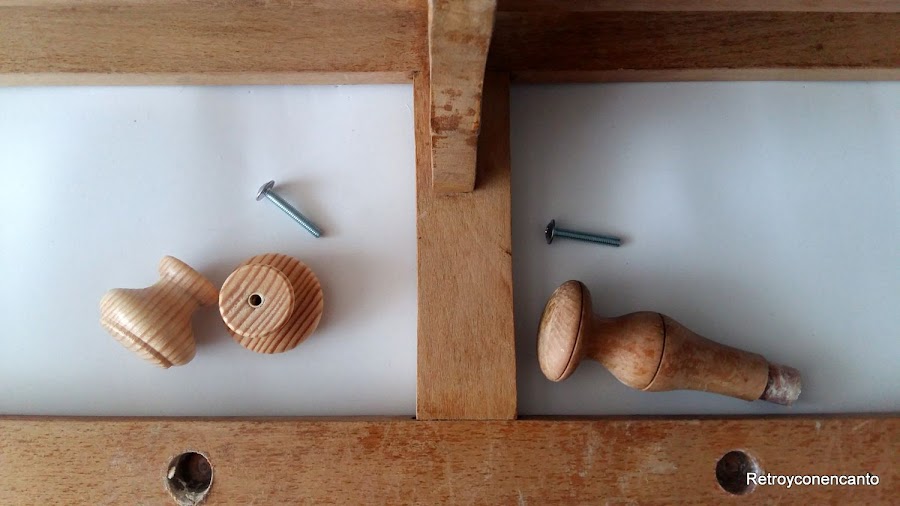 Como nos iba a resultar complicado localizar una semejante, nos decantamos por adquirir un par de pomos de madera para que sustituyeran las dos piezas centrales de nuestro nuevo auxiliar.